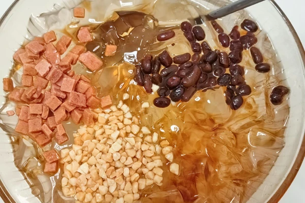 Bingfen (Chinese: 冰粉; pinyin: bīngfěn), also called ice jelly, is a Chinese dessert native to Southwest China in provinces such as Sichuan, Guizhou, and Yunnan. It is served as a bowl of iced transparent jelly, traditionally made from the seeds of the Nicandra physalodes plant. In modern times, bingfen can also be made from konjac root. The jelly can be topped with toppings like haw flakes and wolfberries. It is commonly sold in the summertime as a street food. -- https://en.wikipedia.org/wiki/Bingfen